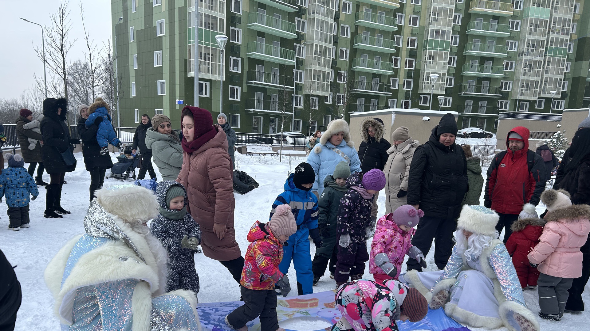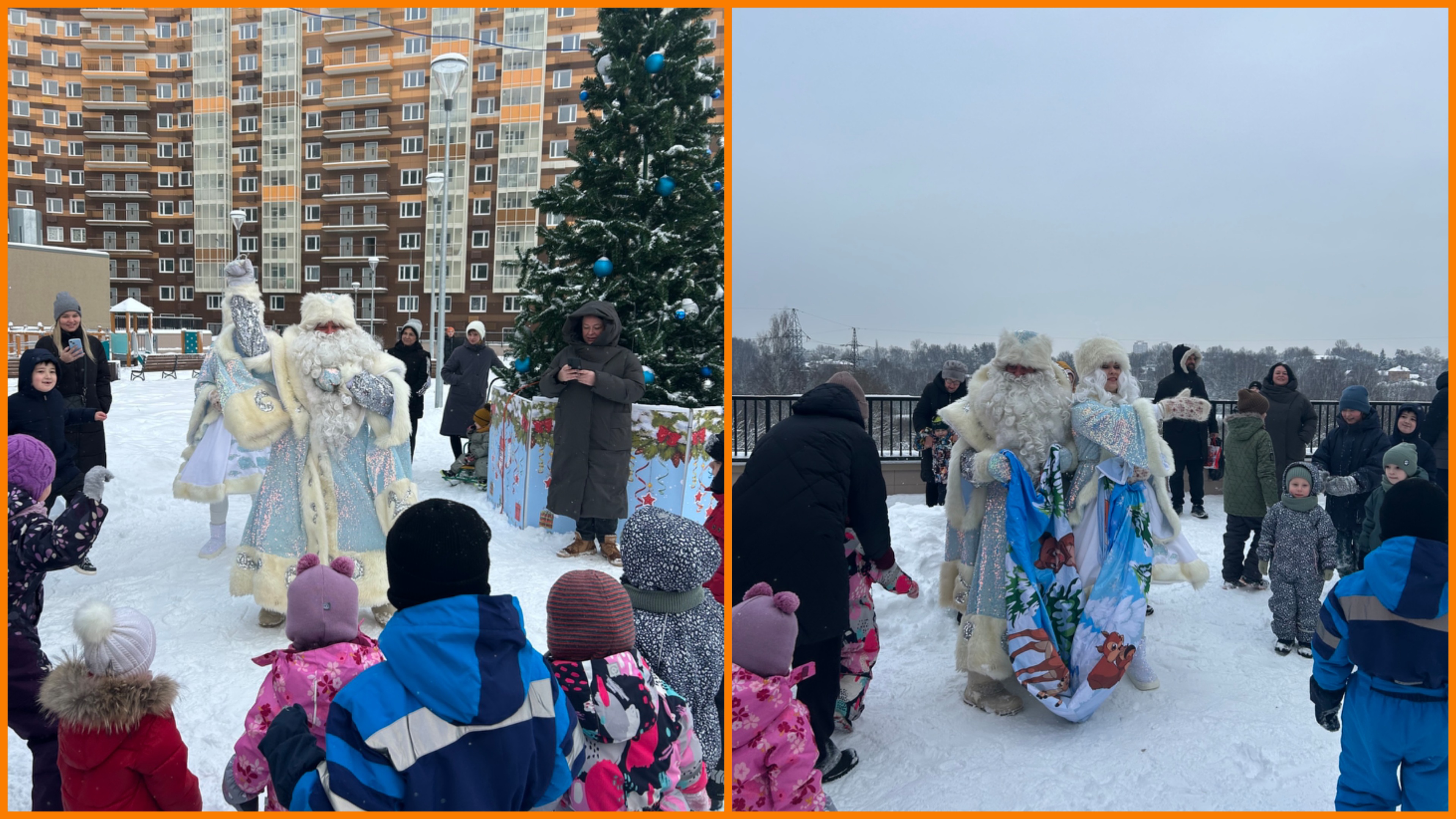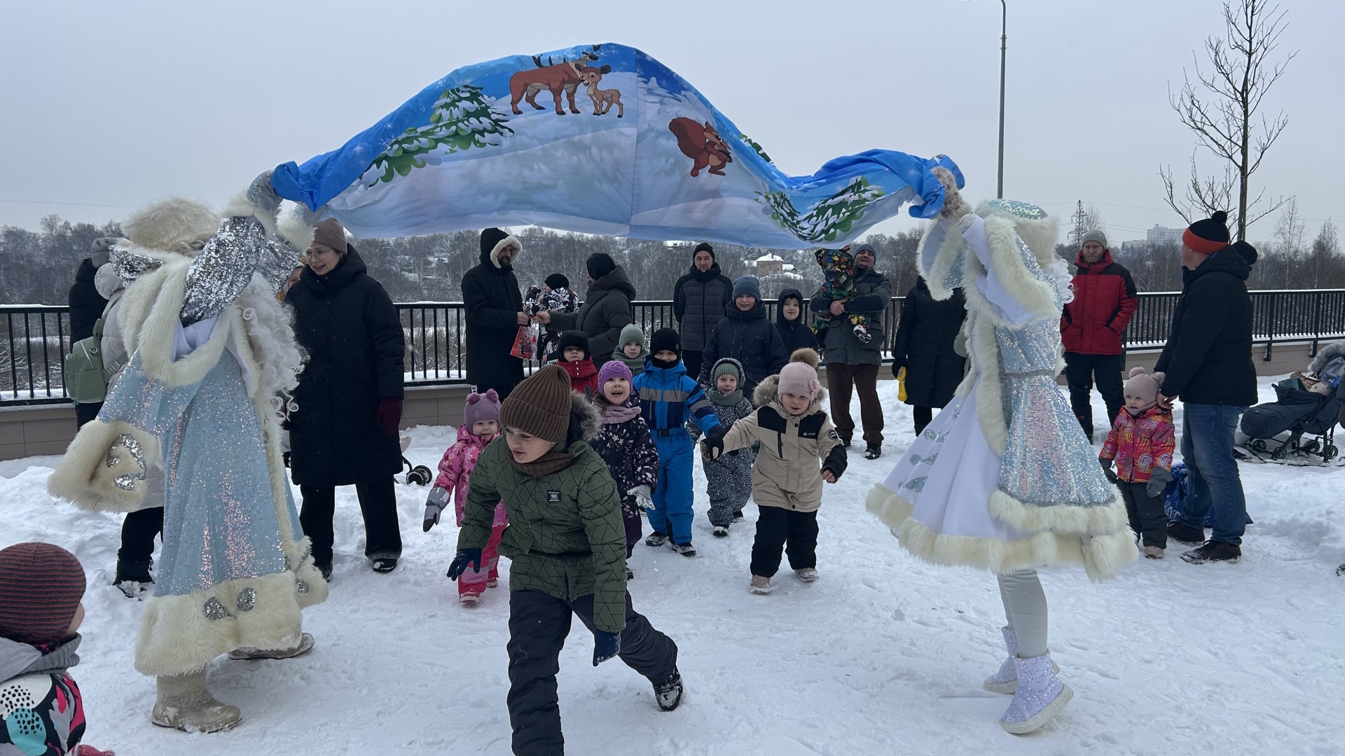 Для детей была организована яркая пра0здничная программа на свежем воздухе. Детвору развлекали Дед Мороз и Снегурочка, а программа включала веселые конкурсы, танцы и хороводы вокруг ёлки.
