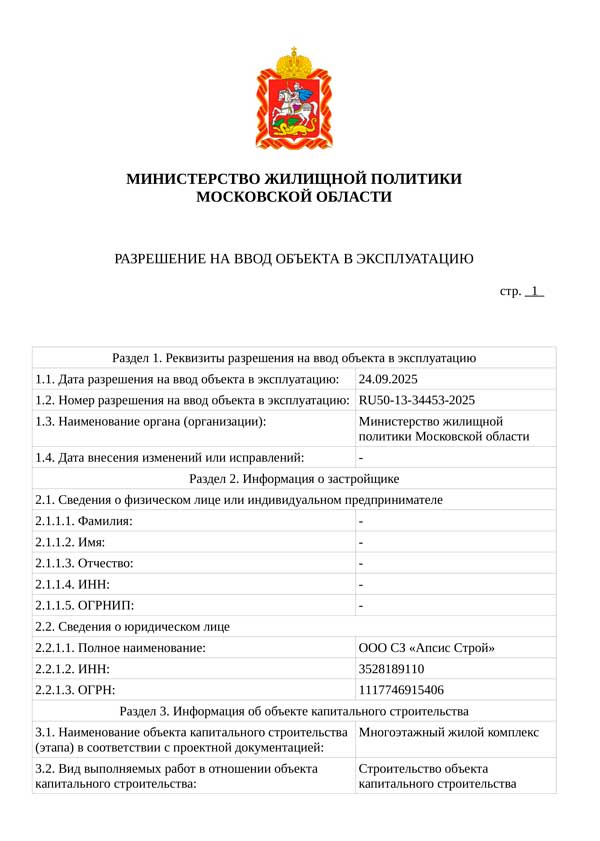 Разрешение на ввод объекта в эксплуатацию выдано 24 сентября 2025 года Министерством жилищной политики московской области.